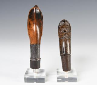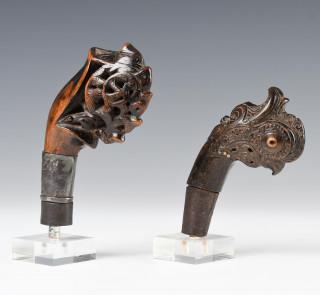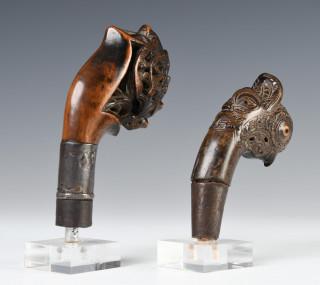 one shaped as a cockatoo, carved in water buffalo horn, with inlaid eyes, iron selut, the other made of wood with an open worked floral and partly zoomorphic design, with a silver and an iron collar.