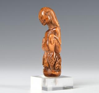 showing a seated demon figure with raised legs on a base of tumpal, long free flowing hair, the right hand touching the right shin, the index and pink touching the pot belly.