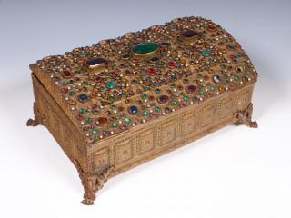 De deksel ingelegd met gekleurde en geslepen glasstenen. Geheel op koperen klauwpoten.