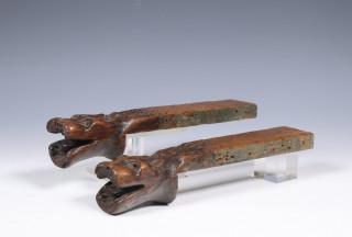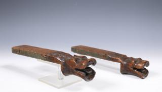 Paar notenhouten ornamenten, 18e eeuw, versierd met leeuwenkoppen.