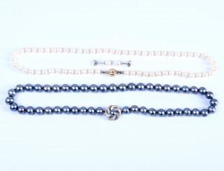 Two cultured pearl necklaces. One with gray freshwater pearls (8 - 8.5 mm) and one with white pearls (5 - 5.5 mm). Both on a gold clasp. Hereby a pair of white gold pearl stud earrings