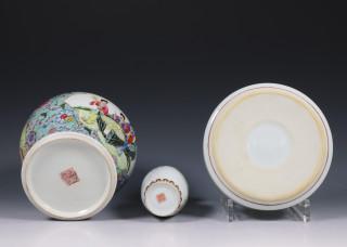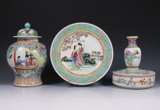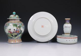 comprising a blauster vase and cover, a plate and a bowl variously painted with ladies and a small vase with flowers, apocryphal Qianlong marks