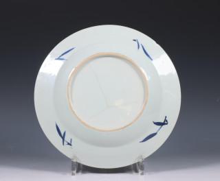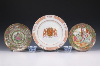 comprising a blue and white plate with flowers (star crack), two various Canton famille rose plates, two blue and white cups and a Japanese armorial dish