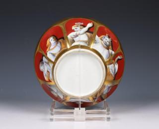 Uitgevoerd met geschilderde decoratie van klassieke figuren in vakverdeling. Deels verguld.