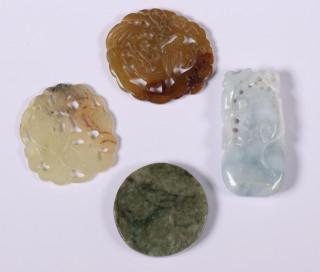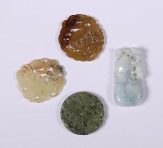 three of circular shape and variously carved with flowers and birds, one jadeite pendant shaped as a chilong clambering onto a double gourd