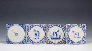 Delft, vier blauw wit aardewerk dierdecor tegels, 17e eeuw;