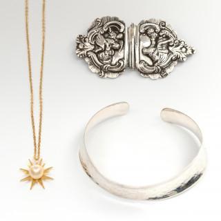 14 k. Gold star-shaped pendant, set with a cultured pearl. On an 18 k. gold chain link necklace. Hereby a silver torque bracelet and a brooch