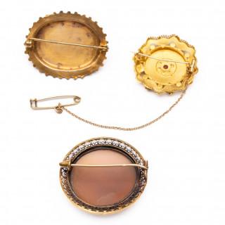 Eén met ronde schelpcamee met decor van een dame in een landschap, één met bloemen en bezet met paste en zaadparels en één met granaat en gedecoreerd met spinnetjes