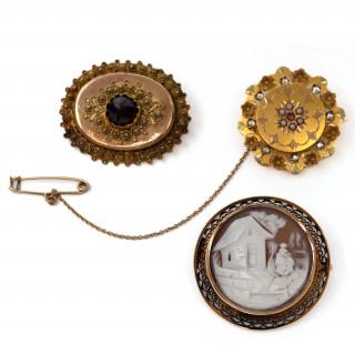 Three 14 k. gold brooches. One with a round shell cameo decorated with a lady in a landscape, one with flowers and set with paste and seed pearls and one with garnet and decorated with spiders