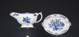 Worcester blauw witte onder schotel en sauskom (haarscheuren), 18e eeuw