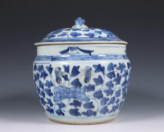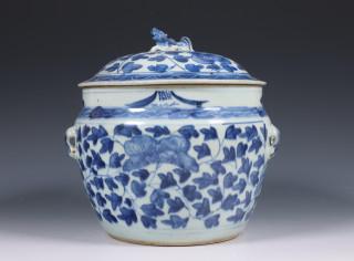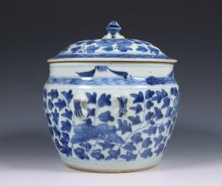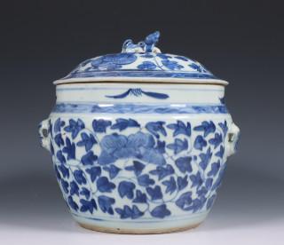 moulded with lug handles and decorated with flowers (rim of cover restored)