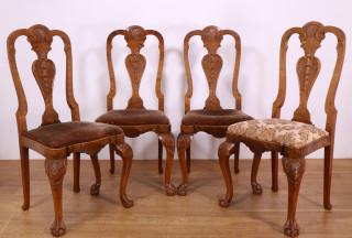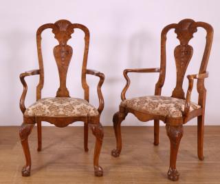 Vier notenwortelhouten stoelen en twee armstoelen in Queen Anne-stijl.