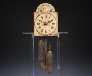 Houten geschilderde wijzerplaat met decoratie van bloemen. Compleet met slinger en twee gewichten.