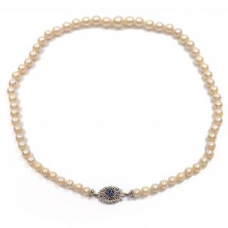 De parels met een diam. van ca. 7 - 10 mm. Aan een 18 kt. witgouden sluiting bezet met een cluster van kleine blauwe saffier (met Oostenrijks importkeur 1925 - 1965)