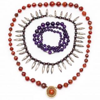 Three beaded necklaces. One of carnelian with 14 k. gold pendant (originally a clasp) set with carnelian, one of amethyst with silver clasp and one of glass garnet with silver drops