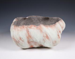 gelobde glazen schaal in grijs en rood, de buitenzijde met zand structuur. Niet gesigneerd