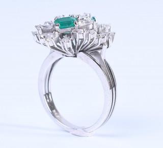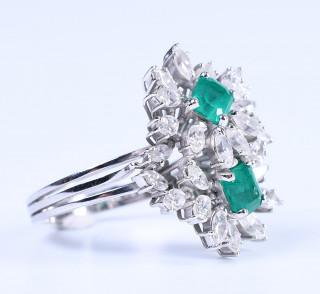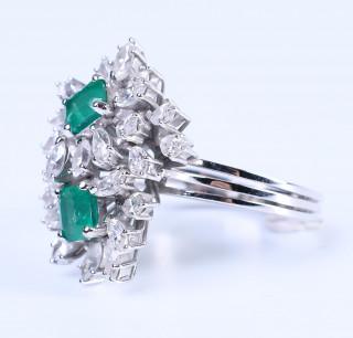 14 k. White gold cocktail ring, 1960s. Set with two emerald cut emeralds (approx. 4.9 x 4 mm) and many marquise cut diamonds with a total weight of approximately 1.00 ct.