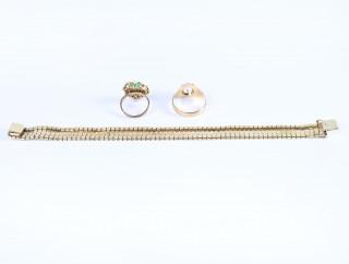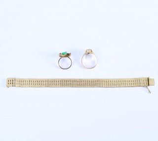 Below legal gold alloy (8 kt.) gold bracelet. Hereby two rings, one in 14 k . gold set with an imitation diamond, the other below legal gold alloy, with a green stone