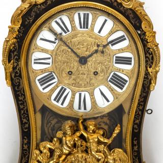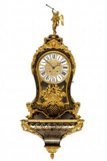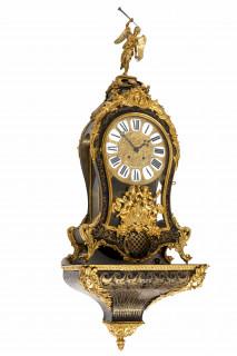 Uurwerk uitgevoerd met gaand en slagwerk op bel, bronzen wijzerplaat met wit emaille cartouches. Kast en console uitgevoerd in Boulle techniek en verguld bronzen ornamenten.