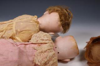 Bestaande uit pop met gehaakte blauw/witte jurk deels papier mache lijf, kop gemerkt FSBJ Paris. Pop met doopjurk, gemerkt Heubach Küppelsdorf320.3. Germany. Pop met slaapogen en roze jurk en blond haar, gemerkt Made in Germany, 390, AZM. En een pop met slaapogen, gemerkt SFBJ, 301, Paris in een roze zijde jurk met hoed (kop gelijmd).