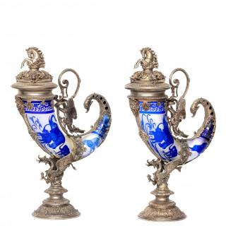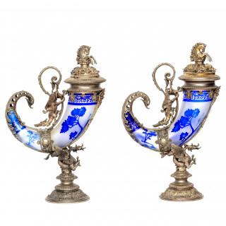 Paar blauw cameo glazen sierhoorns geplaatst in nikkelen monturen, 20 eeuw;