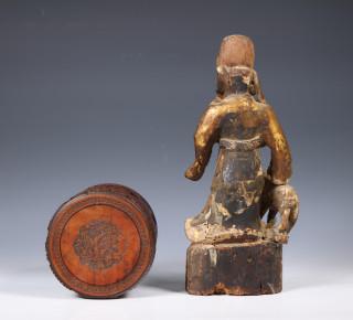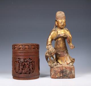 China, verguld gestoken beeld en ronde bamboe dekseldoos,