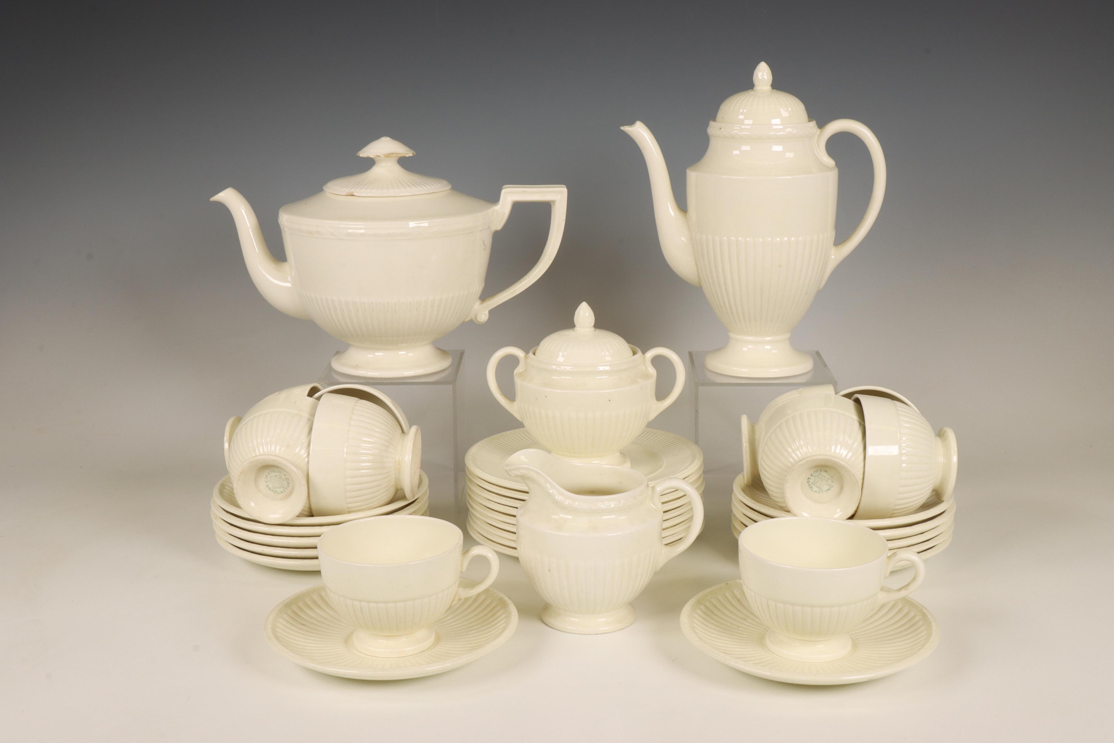 Bestaande uit; theepot, koffiekan, suikerpot, melkkan, 10 koffiekopjes en 12 schotels, 9 bordjes. (schade aan deksel en tuit)