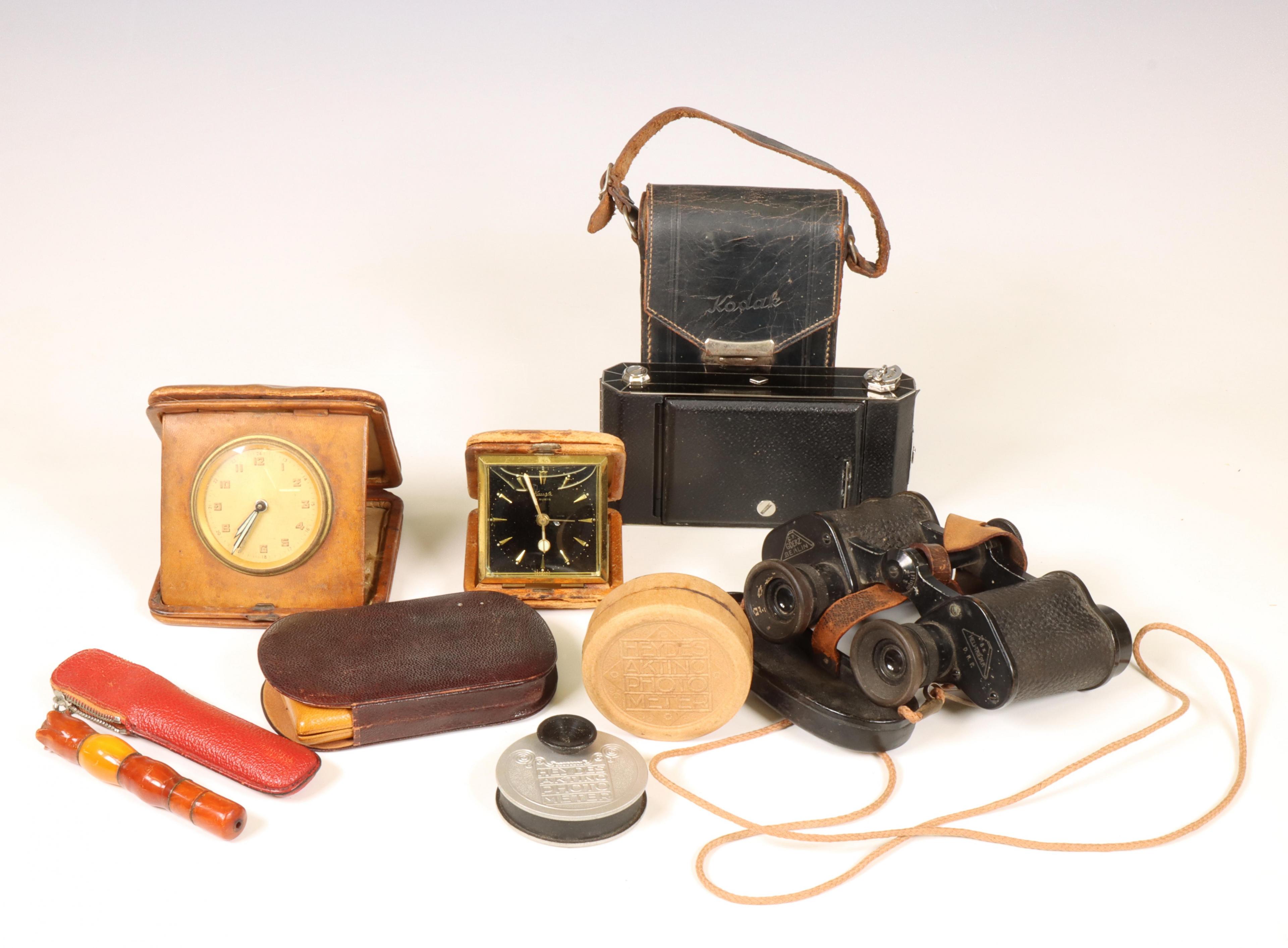 Binoculaire verrekijker, twee reisklokjes en een opvouwbare verrekijker;