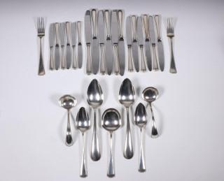 drie dinervorken, twee dinerlepels, paar sauslepels, paar groentelepels en aardappelopdienlepel, diverse meesterteken, zes diner-, zes dessert en zes vruchtenmesjes, 1e gehalte