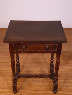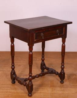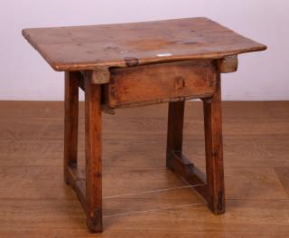 met lade. Hierbij eikenhouten tafeltje, 18e eeuw, met lade. Op vier -door H-regel verbonden- poten. Blad niet origineel