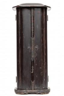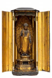 the two doors revealing a figure of Buddha Amitabha standing on a stepped base, mandorla behind him (fingers and toes chipped away, splits, losses to neck and robe, wear to lacquer, general damages and wear as expected)