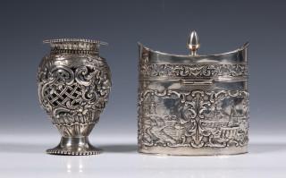 scharnierendbus schuitvormig, mt. Schoonhovense zilverfabriek Schoonhoven 1909, 2e gehalte, ajour eivormig vaasje, mt. Gebr. S. & R. Reitsma Sneek 1895, 2e gehalte,