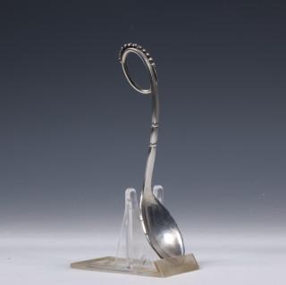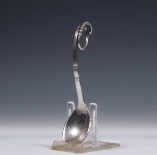 bladvormige bak en gekrulde steel met bolletjesversiering, mt. G. Jensen 1915-1930 Kopenhagen 1929 essayeur C.F. Heise(1904-1932). 2e gehalte,