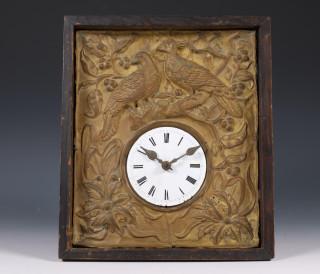 Met latoenkoperen voorstelling van vogels, emaille wijzerplaat. Compleet met twee gewichten en slinger.