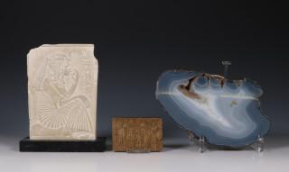 Twee Egypte museumcopieën en geslepen stuk agaat.