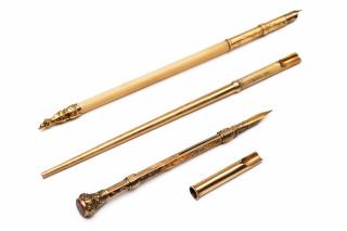 18 k. gold pen, 19 century. The handle is made of imitation ivory, finished with a gold tip. The gold fully decorated with engraving. Herewith a 15 k. gold pen and a 14 k. gold pen (the point is missing on both) and a gold-plated dip pen set with carnelian (slightly damaged).