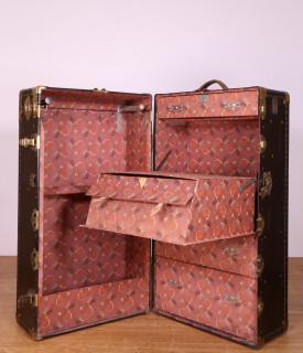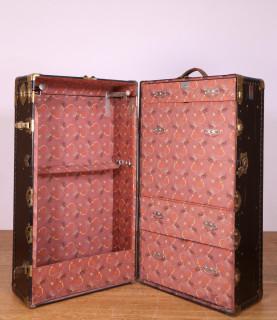 Uitgevoerd met interieur met hanggedeelte, laden en uitklapbaar bureau. Geheel gestoffeerd met katoenen stof met Art Deco dessin in rood bruin tinten. Exterieur met metalen banden, koperen sluitingen en nagels.