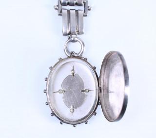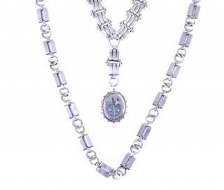 Two coarse silver link necklaces, first half 20th century. One with a locket depicting a hummingbird and flower branch made in enamel.