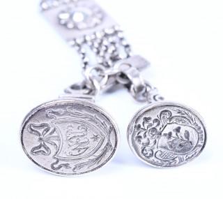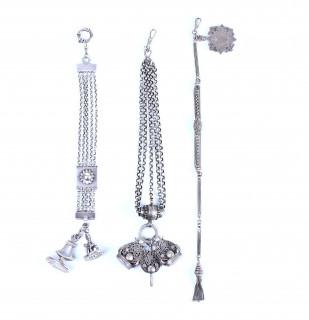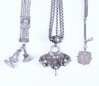 Twee zilveren chatelaines en een horlogeketting, 19e eeuw.