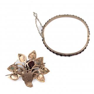 In de vorm van een mand met bloemen, bezet met Boheems granaat (mist één). Hierbij een stijve armband van tombak, eveneens bezet met Boheems granaat