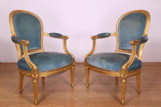 Frankrijk, paar verguld gelakt beukenhouten fauteuils in Louis XVI-stijl, 19e eeuw,