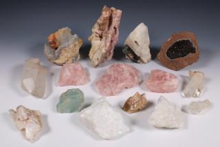 Collectie mineralen, voornamelijk kwartsen, ondermeer bergkristal en rozekwarts