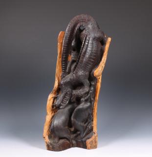 Tanzania, Makonde, houten sculptuur, krokodil in gevecht met twee antilope