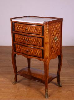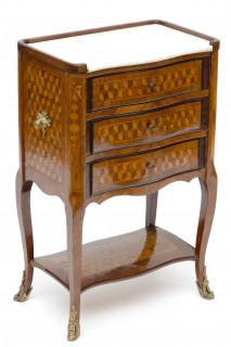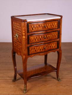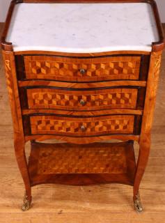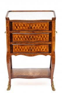 met wit marmeren blad. In het gebogen front drie laden. Het geheel versierd met marqueterie de cubes en verguld bronzen beslag