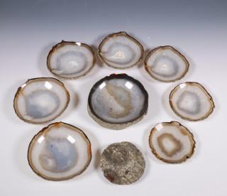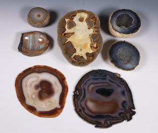 Collectie agaat, twee geodes, nest schalen en diverse gepolijste schijven.