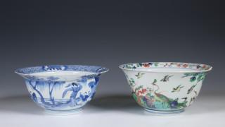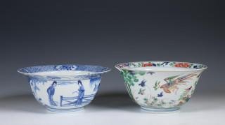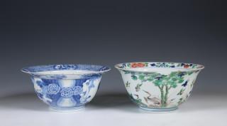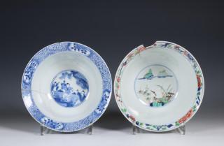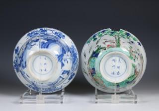 China, a blue and white and a famille verte bowl, Kangxi period (1662-1722),