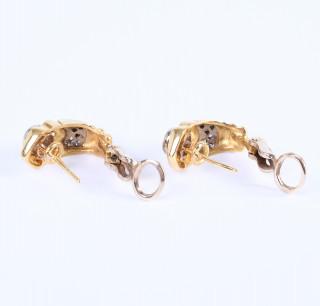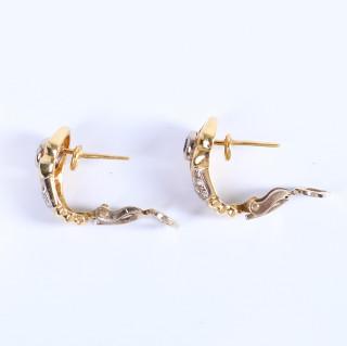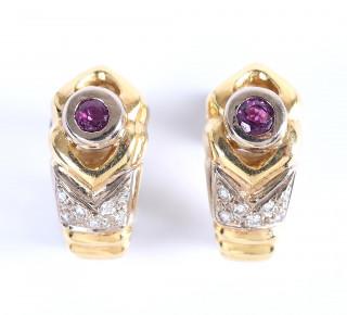 18 k. Two tone gold stud earrings, set with a ruby and small brilliant cut diamonds