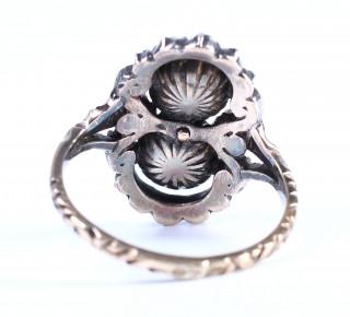 centraal bezet met twee grote roosgeslepen diamanten (ca. 7 x 6 en 7,4 x 6 mm), in een entourage van kleinere roosgeslepen diamanten