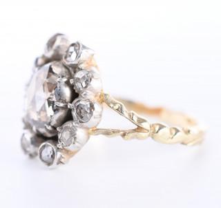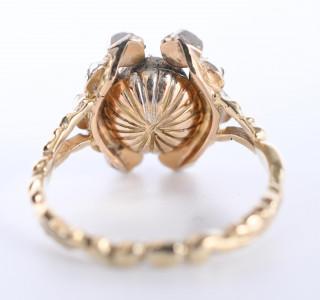 14 k. Gold and silver ring, centrally set with a rose-cut diamond (approx. 6.4 x 5.5 mm), with an arch on either side, also set with rose-cut diamond.