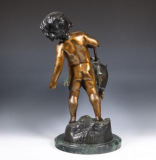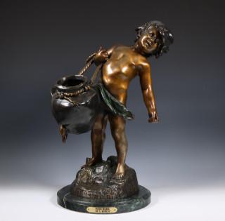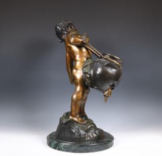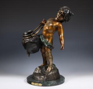 Auguste Moreau (1834-1917), bruin en groen gepatineerd bronzen sculptuur, 'De Waterdrager', 20e eeuw;